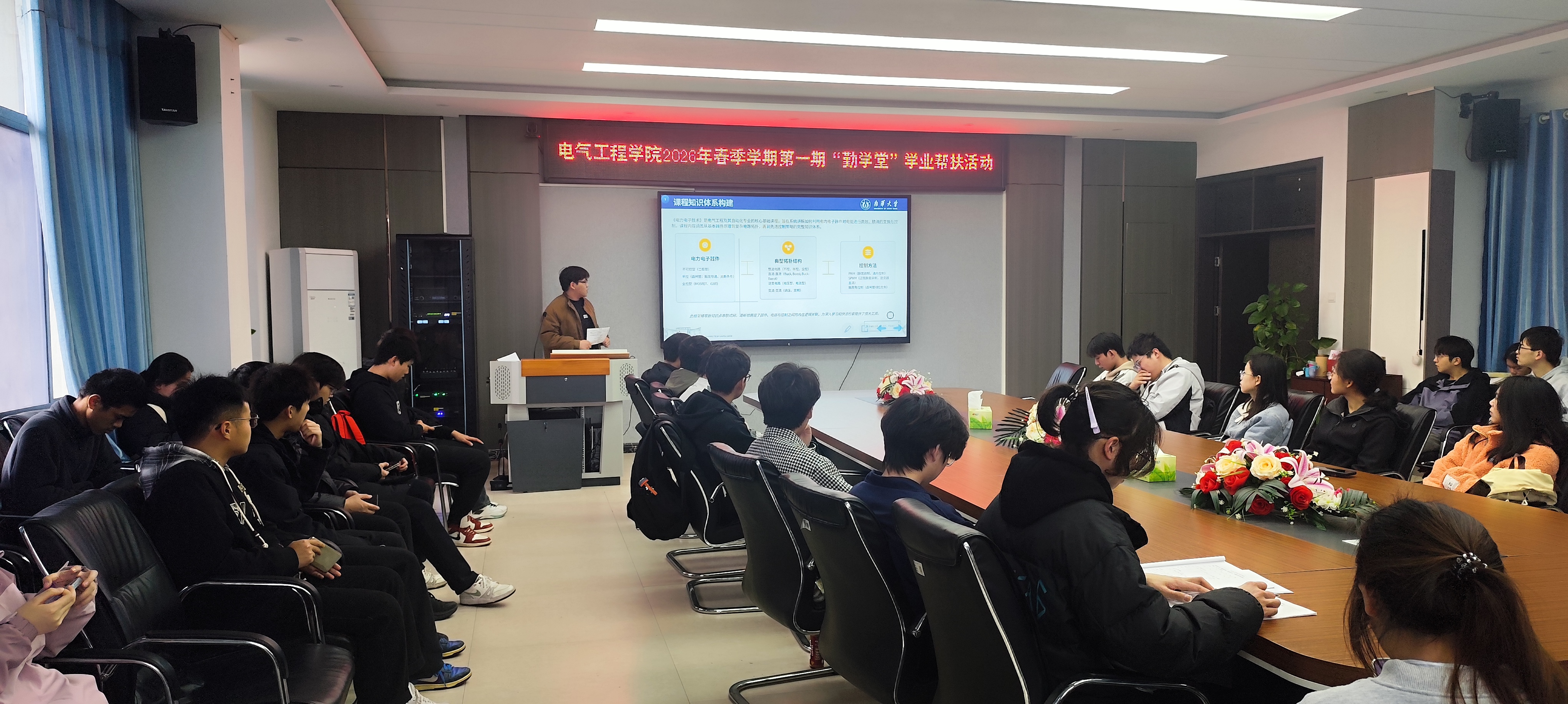 4月2日,威廉williamhill在崇业楼B301会议室成功举办2026年春季学期第一期“勤学堂”学业帮扶活动,聚焦“电力电子技术”课程,由国家励志奖学金获得者詹家诚同学担任主讲。